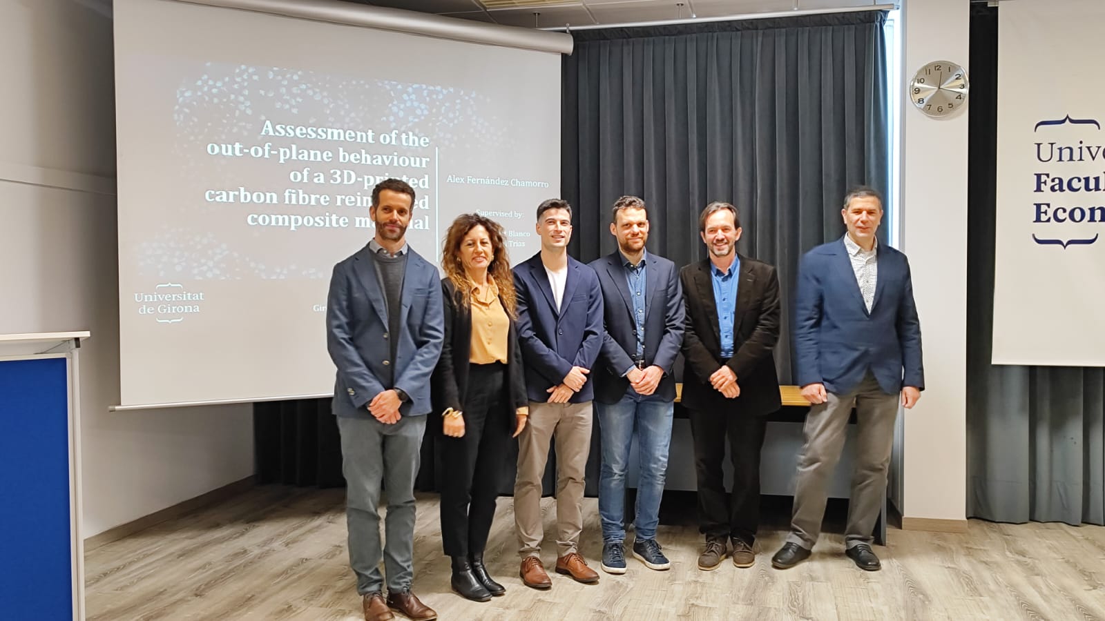On November 28, Alex Fernández successfully defended his PhD thesis titled “Assessment of the out-of-plane behaviour of a 3D-printed carbon fibre reinforced composite material”at the University of Girona. His research was co-supervised by Dr. Norbert Blanco (Universitat de Girona) and Dr. Daniel Trias (Universitat de Girona).